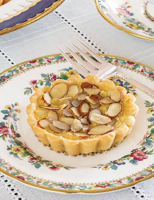 - Place Tartlet Shells on a rimmed baking sheet. Using a levered 2-teaspoon scoop, portion 1 scoop preserves into each prepared Tartlet Shell. Divide almond mixture among tartlet shells. Arrange sliced almonds on top of filling, covering surface.