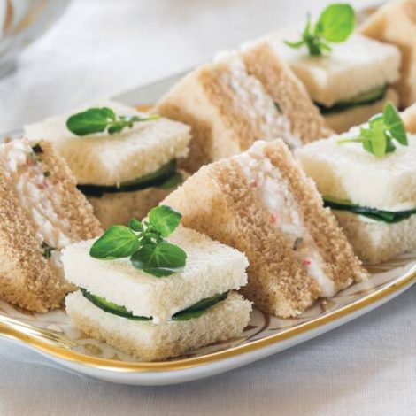 These Cucumber-Crème Fraîche Tea Sandwiches are a light and refreshing savory for afternoon tea. Cucumber-Crème Fraîche Tea Sandwiches pictured with Basil-Shrimp Salad Tea Sandwiches.
