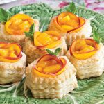 - Arrange 3 peach slices around center of pastry shell, overlapping slightly to fit.