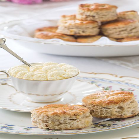 Filled with walnuts, banana, and pineapple, these Hummingbird Scones incorporate the delicious flavors of a classic cake into a toothsome scone. These scones pair perfectly with the Devonshire cream piped into the demitasse cup.