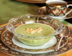 Traditional broccoli soup is enhanced with creamy mascarpone cheese in this decadent dish.