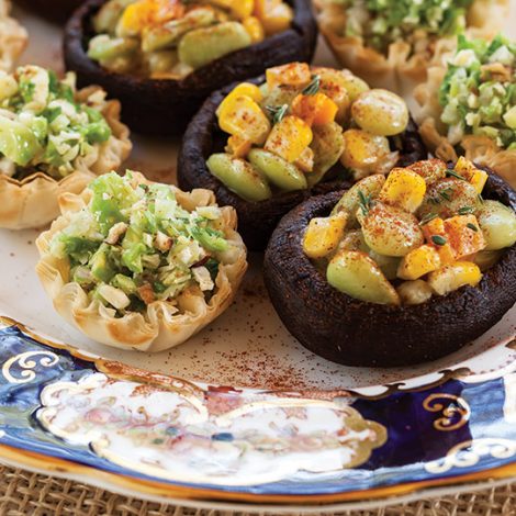 These Smoked Gouda Cups with Brussels Sprouts Slaw are a special treat. Pictured with Succotash-Stuffed Mushrooms.