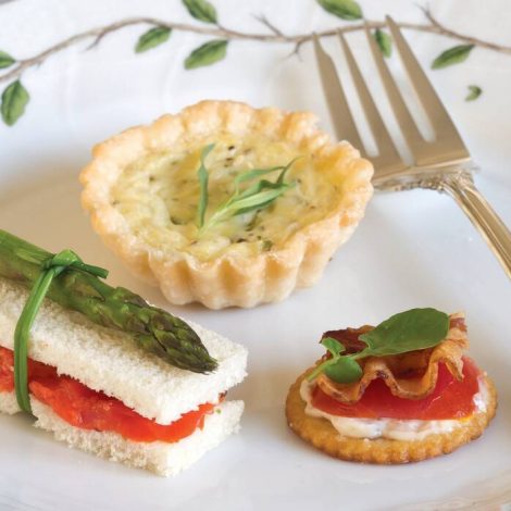 These Tomato-Bacon-Watercress Canapés are pictured with Salmon-Asparagus Tea Sandwiches and Shallot-Tarragon Quiches.