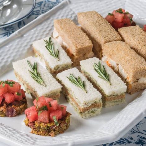 These Watermelon, Pancetta & Pistachio Canapés are simple and delicious. Canapés pictured with Olive–Goat Cheese Tea Sandwiches and Mandarin Orange & Cashew Chicken Salad Tea Sandwiches