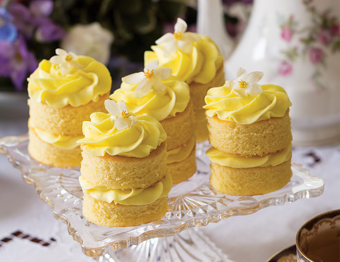 Lemon-Ginger Cake Stacks are topped with a decadent buttercream icing and garnished with edible fresh begonias.