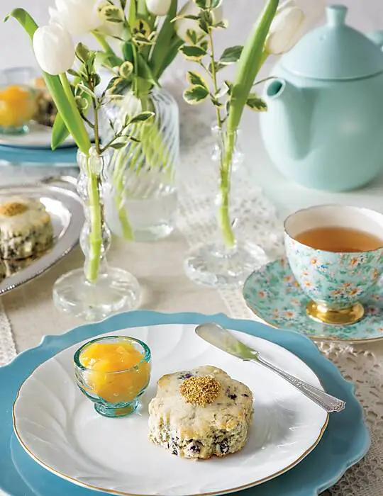 Chamomile isn’t just for sipping at bedtime. It is a key ingredient and garnish in this whimsically shaped scone laced with freeze-dried blueberries and creamy white chocolate as well.