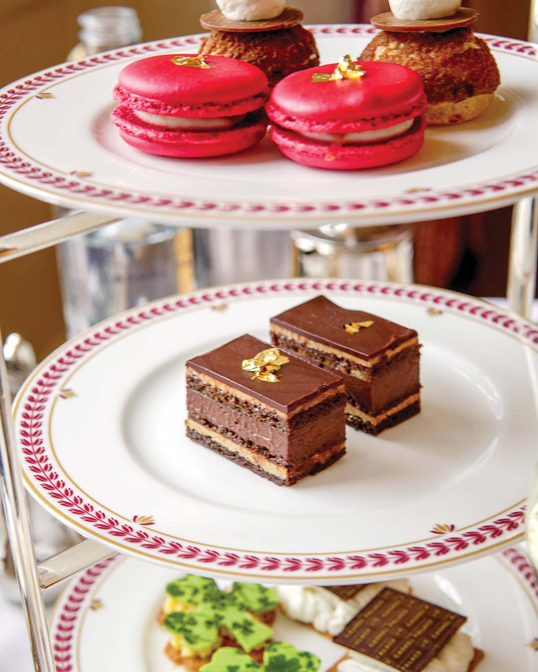 Plain and fruit scones are offered with Veronica Molloy’s Tipperary-made Crossogue preserves and clotted cream, a warm-up to a tempting array of pastries that could include carrot cake with salted caramel, hazelnut cake with white chocolate, and cappuccino mousse. Battenburg cake, cheesecake, and the classic puff pastry known as Saint Honoré often appear in the rotation. As a tribute to the palace’s Guinness connection—Arthur Guinness’s father used hops from the palace garden and water from its well to brew ale for the house—the chef infuses traditional Black Forest chocolate cake with Guinness rather than kirsch and fills it with sour cherries and dark chocolate.