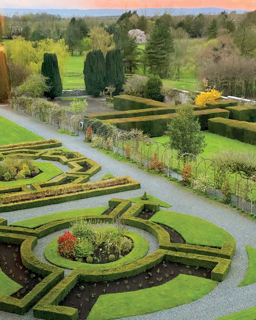 Formal gardens at Kilkea Castle, County Kildare, are especially pretty at sunset. Photograph by Margaret M. Johnson.