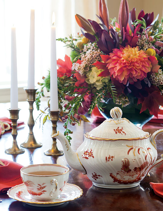 The warmth of a polished mahogany table and the sparkle of bone china (Richard Ginori Sienna Rust) set an elegant table for a formal fall dinner. The rich purples, reds, and golds in the flower arrangement echo the colors you’ll soon see outside your window.