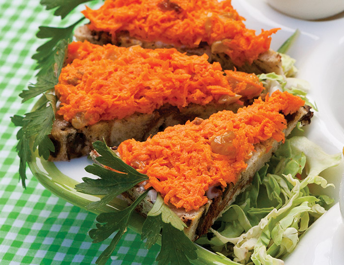 9 Tasty Carrot Recipes for Teatime April 14, 2025 FacebookTwitterPinterestWhatsApp 7. Carrot Canapés Freshly grated produce, golden raisins, mayonnaise, and parsley combine to create appetizing Carrot Canapés.