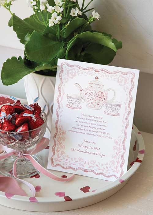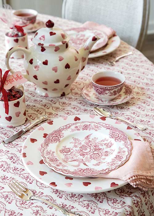 Emma Bridgewater Pink Hearts 4-mug teapot, 10 1⁄2-inch plate, small mug, and large heart-shaped tin from Emma Bridgewater. Burgess & Leigh Asiatic Pheasants Pink dessert plate and bamboo-handled serving plate; Crown Ducal Bristol Pink creamer, covered sugar bowl, flat cup and saucer set, salad plate, 9-inch oval vegetable bowl, 12-inch oval serving platter, 2-tiered serving tray, 3-tiered serving tray, and double egg cup; Towle Silver Old Master teaspoon, salad fork, demitasse spoon, butter spreader, and sugar tongs from Replacements, Ltd. Invitations from Sarah O’Mary Designs. Sibyl tablecloth from Parterre. Glass dish, vessel for flowers, napkins, and bowls for condiments from private collection.