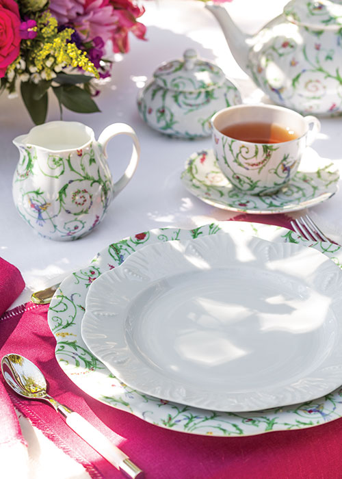 Royal Limoges Nymphea Colibri teapot, creamer, sugar bowl, dinner plate, tea cup, and tea saucer, open vegetable bowl, oval platter medium, and rectangular cake platter; Royal Limoges Ocean White dessert plate, tray, and salad bowl; Capdeco Conty White cake server and flatware from BIA Cordon Bleu. Festival tablecloth, Farell place mats and napkins from Sferra. Flowers by Lindsey Harrington, No. 5 Floral Design. Location courtesy of Gail and Bob Greene. Glass condiment bowls, spoons, and silver napkin rings from private collection.