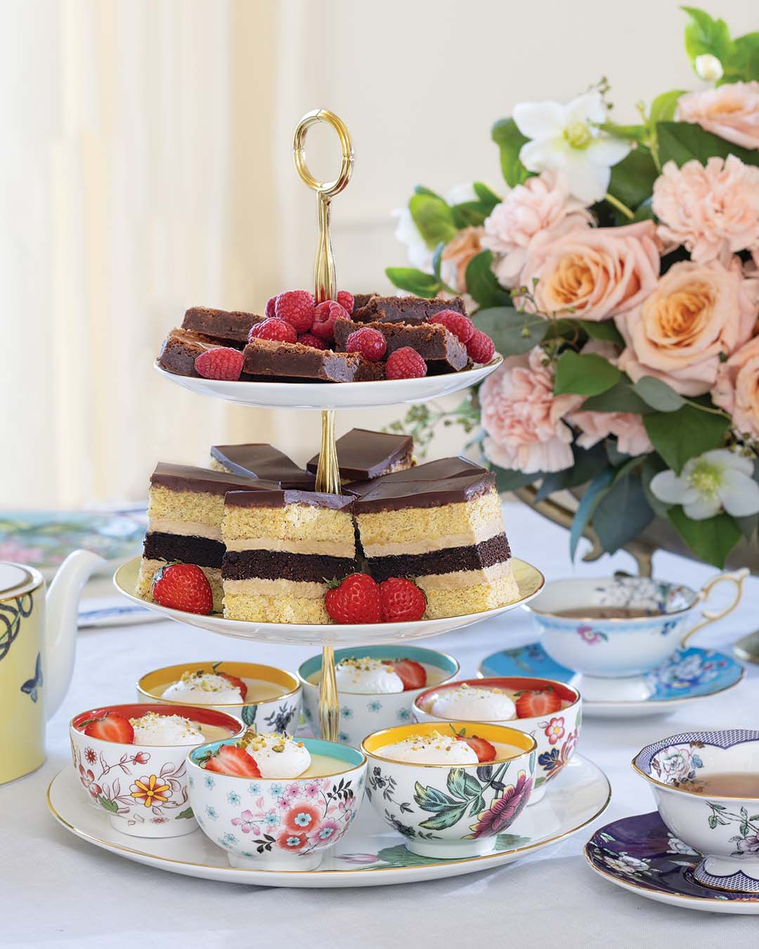Conclude your tea with a tiered tray of Opera Cake, Saint Clements Posset, and Wedgwood Chocolate Brownies along with The Tea Shoppe’s Buckingham Palace Garden Party Tea.