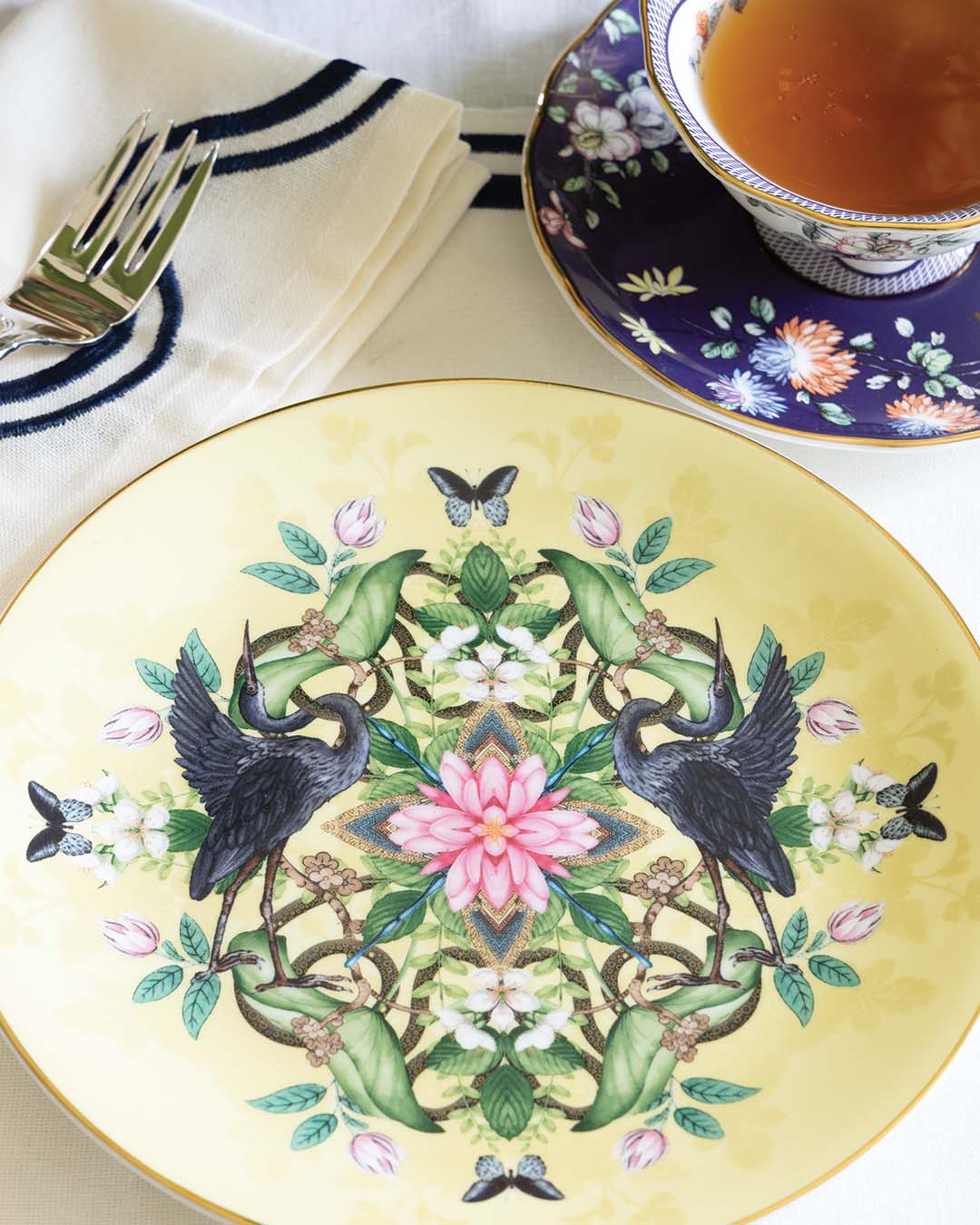 Wedgwood Wonderlust (Waterlily) teapot, salad plate, and 3-tiered serving tray; Wonderlust (Blue Pagoda) creamer and covered sugar bowl; Wonderlust teacup and saucer sets, dessert plates, and tea bowls; Reed & Barton English Chippendale salad fork, teaspoon, and modern hollow knife from Replacements, Ltd. Madeline place mat and napkins from Anthropologie. Location courtesy of Lauren Johnston.
