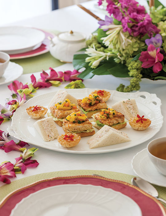 For the savories course, your guests will enjoy our Tarragon-Shrimp Sandwiches, Pineapple, Ham & Brie Phyllo Cups, and Mango Salsa & Mahi Mahi Canapés with Capital Teas’ Organic Ginger Peach Oolong.