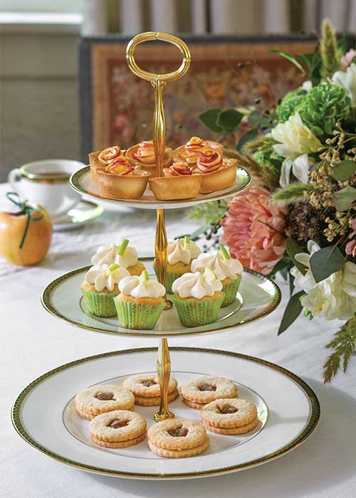 Conclude your festive fall tea with delightful sweets, such as our Rosy Apple Tartlets, Oat-Pecan Linzer Cookies with Apple Butter Filling, and Apple Cupcakes with Cardamom–Cream Cheese Whipped Frosting. Pair these sweets with a pot of Apple Pie Chai Herbal Tisane.