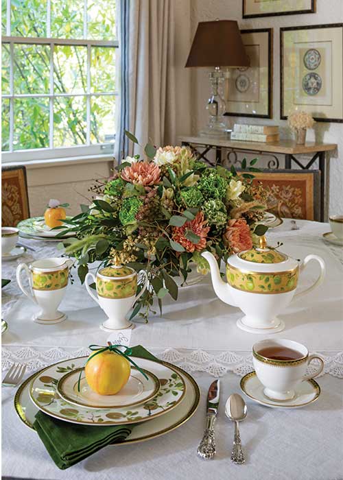 Waterford China Golden Apple teapot, creamer, covered sugar bowl, accent salad plate, and 9-inch oval vegetable bowl; Wedgwood Chester (Gold Verge) dinner plate, footed cup and saucer set, bread and butter plate, and 3-tiered serving tray; Wedgwood Chester salad plate, 15-inch oval serving platter, and 13-inch oval serving platter; Reed & Barton French Renaissance modern hollow knife, teaspoon, salad fork, and demitasse spoon from Replacements, Ltd. Eden Green buffet napkins from World Market.