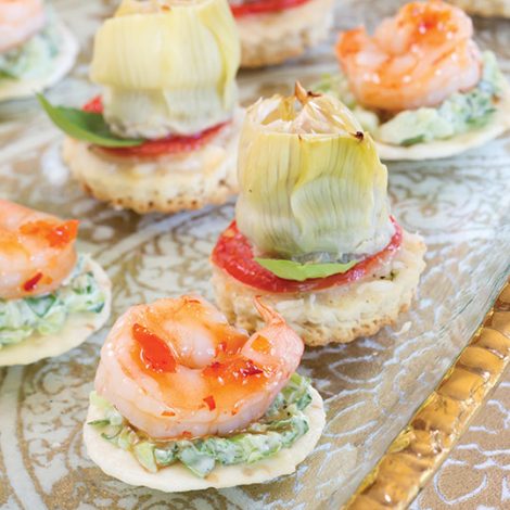 These tasty Artichoke-Tomato Canapés are full of flavor from fresh basil, oregano, mozzarella and Parmesan cheese, Campari tomato, and artichoke hearts. Pictured with Asian Shrimp and Bok Choy Slaw Canapés.