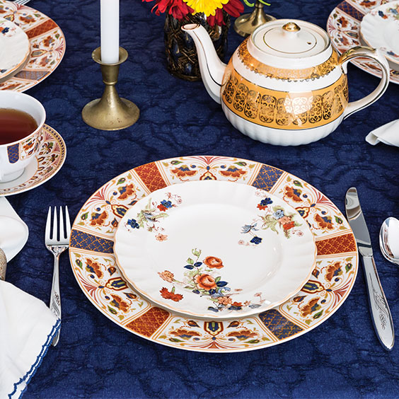 Invite guests to partake of tea at a stunning table boasting the vivid hues of fall against a navy damask tablecloth. Grace the occasion with the vibrant themes on Queens China Imari dinner plates, cups, and saucers and Spode’s Old Clovelly salad plates. Oneida’s Song of Autumn flatware completes the tablescape.