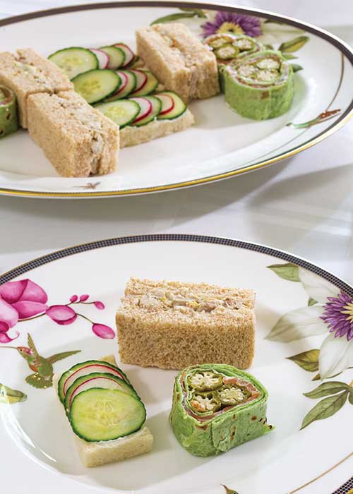 Next, enjoy a trio of savories, such as our Cucumber-Radish Canapés, Smoked Salmon & Pickled Okra Roll-Ups and Chicken & Artichoke Salad Tea Sandwiches, along with a cup of China Oolong Tea.