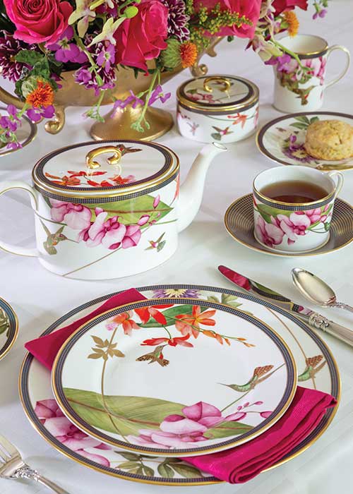 Wedgwood Hummingbird 3-piece tea set, teacup and saucer set, dinner plate, 8-inch plate, 6-inch plate, 2-tier cake stand, and 13-inch oval platter from Wedgwood. Gorham Silver Chantilly modern hollow knife, individual salad fork, and teaspoon from Replacements, Ltd. Cotton buffet napkins from World Market. Condiment dishes, gold spoons, tablecloth, and vessel for lowers from private collection. Location courtesy of Stacy Turner.
