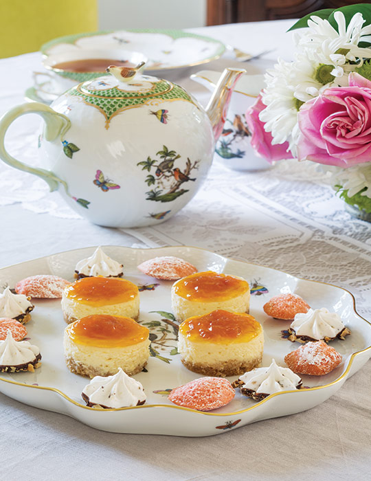 Bring your afternoon tea to a close with a cup of Simpson & Vail’s Almond Sugar Cookie Dessert Tea with Mango-Peach Mini Cheesecakes, Strawberry Mini Madeleines, and Chocolate-Hazelnut Drops.