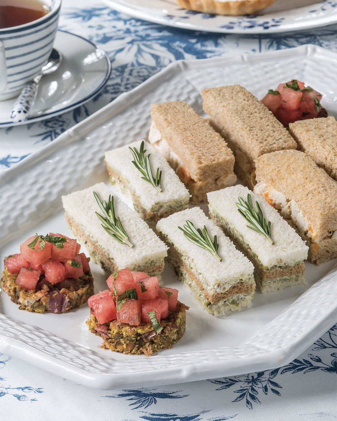 Our delicious trio of savories includes Olive-Goat Cheese Tea Sandwiches, Mandarin Orange & Cashew Chicken Salad Tea Sandwiches, and Watermelon, Pancetta & Pistachio Canapés. Pair these scrumptious offerings with Simpson & Vail’s Nepal Makalu Guranse Organic Black Tea.