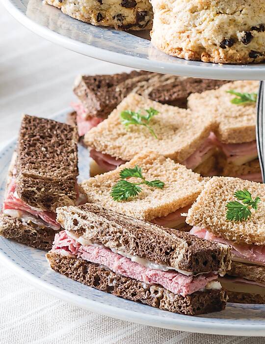 Corned beef, pickling spices, and marbled rye bread combine to create delicious Corned Beef Tea Sandwiches.