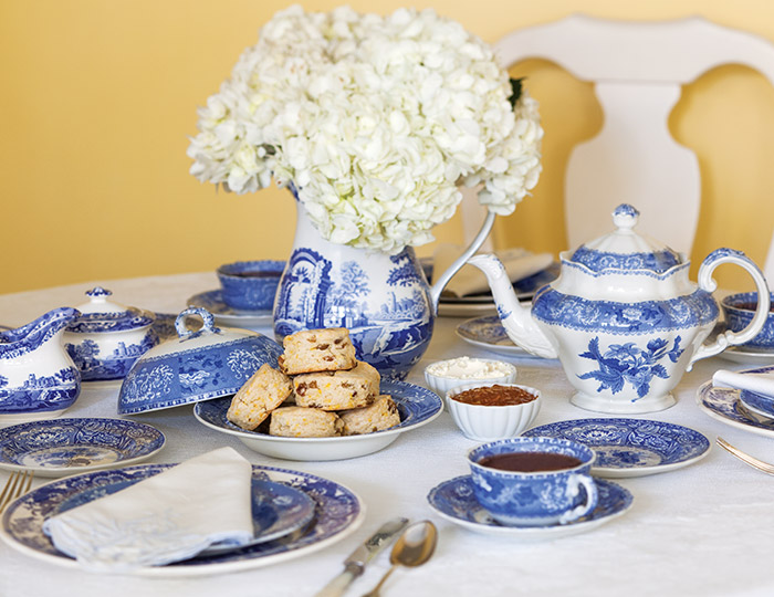 A table set with fresh flowers and blue-and-white china, tea sandwiches, scones, a few simple sweets, and a nice pot of tea are all you need for a cosy English cottage-style tea.