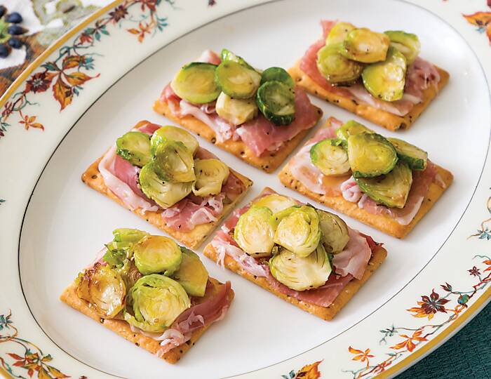 - Cut pancetta into 25 pieces, and place a pancetta piece on each cracker. Arrange Brussels sprouts on pancetta. Brush canapés with Apple Cider Gastrique. Serve immediately.