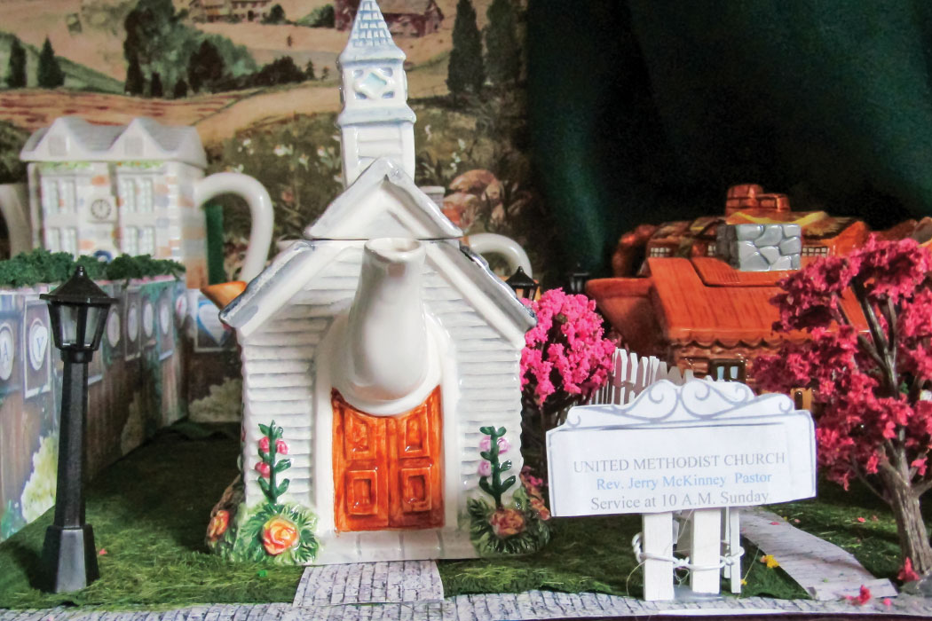 Her spare room, which doubled as an office, was the perfect spot for this project. “Besides the original counter that is built in, there are at least 10 tables that I had or bought online. The most difficult part was find- ing tables that were approximately the same height,” Theresa explains. With the help of a glue gun, she skirted them with pretty fabrics—some even tea themed—and topped them with artificial grass and other fabrics that resembled greenways and pathways. “I just kept ‘building’ as ideas came to me,” chuckles Theresa, who says she used boxes of various sizes to achieve differing heights to add interest to her display. Although she procured most of the lampposts, shrubbery, and other accessories online, she says she could have obtained them from hobby stores that sell model railroad supplies if they had been open and she had been getting out. After purchasing a teapot shaped like a Catholic church, she decided to decorate another small church-shaped teapot with signage appropriate for a United Methodist church, even gaining permission from a