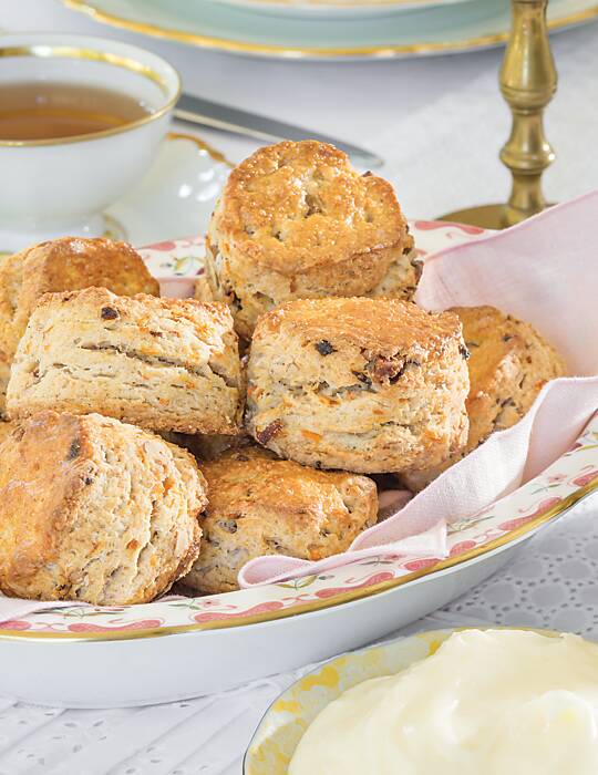 - In a large bowl, whisk together flour, sugar, baking powder, cinnamon, salt, ginger, and allspice. Using a pastry blender or 2 forks, cut butter into flour mixture until it resembles coarse crumbs. Cover and freeze for 15 minutes. Add carrot, raisins, and pecans, stirring until combined. Add cold cream to flour mixture, stirring and folding until a dough begins to form.