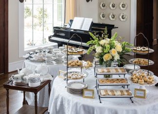 A buffet-style tea, complete with delicious scones, flavorful savories, and whimsically adorned desserts, is...