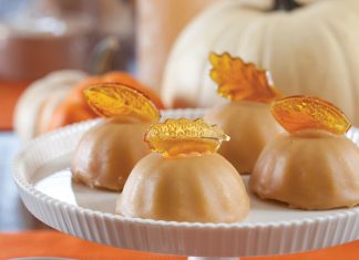 These pretty Caramel Cakes, glazed with caramel and garnished with sugar leaves, seem to announce the arrival of fall.