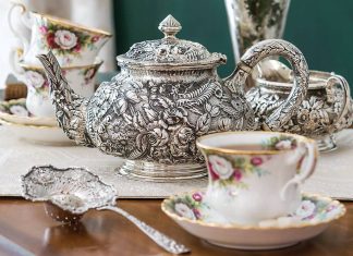 Schofield’s Baltimore Rose sterling silver teapot brings floral beauty to a seasonal table.