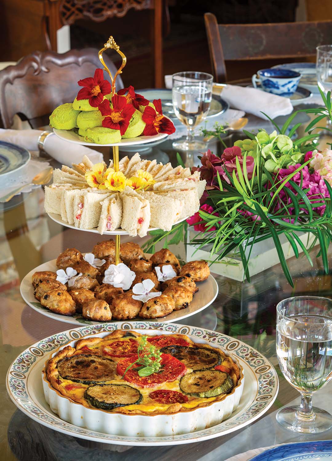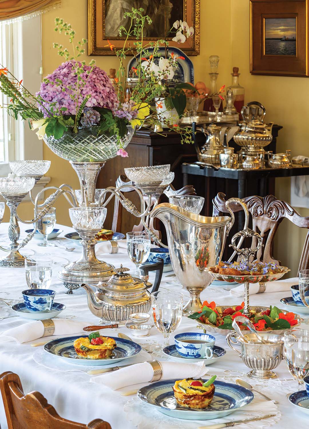 Following an informative drive around town filled with stops at idyllic homes and private gardens, the tour culminates in taking tea at Laura’s wonderful blue-trimmed white house on Tradd Street. Treasured antiques and old-world sophistication embellish the atmosphere to set the scene that makes this experience of taking tea in someone’s home utterly unique. All tea served—typically Darjeeling, Assam, and Earl Grey—is only of the loose-leaf variety, as Laura deems that proper. “I use an 18th-century swivel silver tea strainer,” Laura says. “People feel like it’s the coronation when I pour tea out of a Sheffield silver tea service. I put milk and sugar cubes on the table along with sugar tongs.” For the petite bites to nibble on with copious cups of tea, most of the fare is made by Laura herself and served on her own fine china. She loves making the scones with whole milk and unbleached White Lily flour to be sure they’re “nice and puffy.” The toothsome scones, whether flavored by crystallized ginger, dried currants, or even sweet potatoes, are accompanied by homemade clotted cream, or crème fraîche, and scratch-made jams, such as muscadine.
