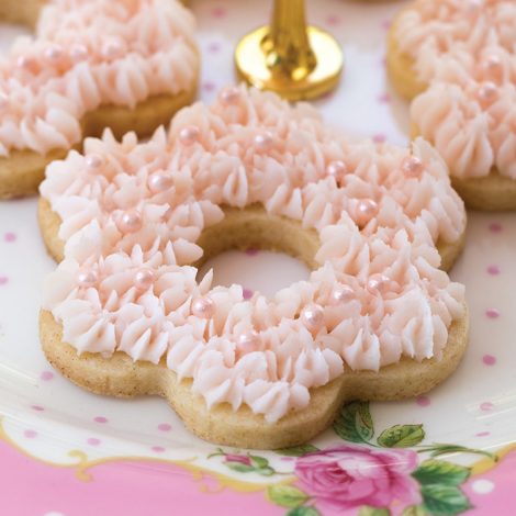 8. Place Pretty Pink Buttercream in a pastry bag fitted with open-star tip (Wilton #21), and pipe buttercream stars onto cookies, covering surface of cookies.