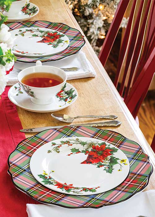 Coastline Imports Cardinal Poinsettia teapot, teacup and saucer set, salad plates from Gracie China Shop. Cream pitcher and sugar bowl from Target. Juliska Ceramics Stewart Tartan dinner plate, bamboo handled serving plate, 2-tiered serving tray, and 15-inch oval serving platter; Oneida Silver Satinique modern solid knife, salad fork, and teaspoon from Replacements, Ltd. Red table runner (discontinued) from Pottery Barn. White stitched napkins from HomeGoods. Canapés platter, red condiment bowls, condiment spoons, and vessel for flowers from private collection.