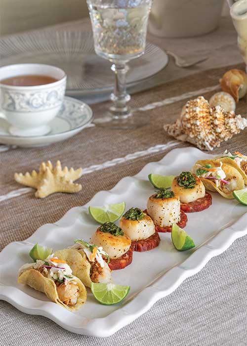 Next, tempt guests with a variety of coastal-inspired savories, including Lobster “Spring Roll” Tea Sandwiches, Seared Scallop & Chorizo Canapés with Herb Sauce, and Fish Taquitos with Creamy Slaw. Pair these delightful bites with a cup of refreshing tea, such as East Indies Tea Company’s Morning Mist Green Tea.