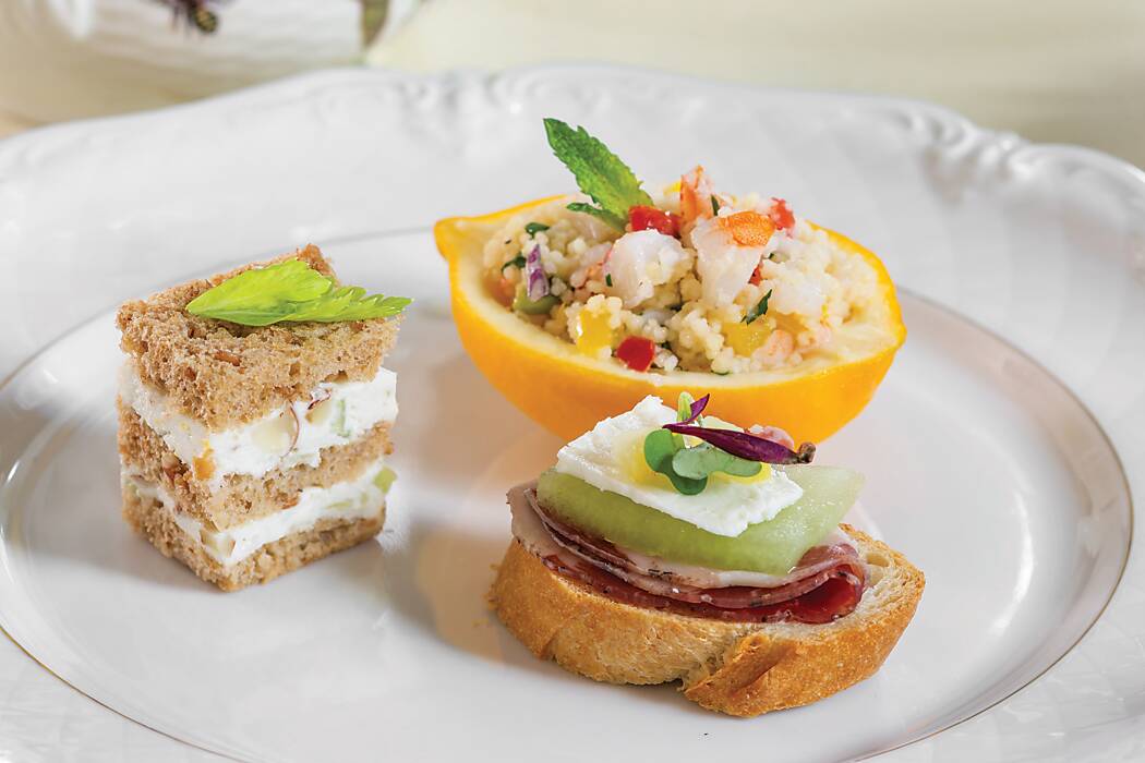 Cream cheese studded with blue cheese, fresh celery, toasted almonds, fennel seeds, and lemon zest, of course, is an amazingly tasty filling for our triple-stack sandwiches. Creamy Celery & Blue Cheese Triple-Stack Sandwiches pictured with Honeydew, Coppa & Feta Canapés and Lemony Couscous-Shrimp Salad.