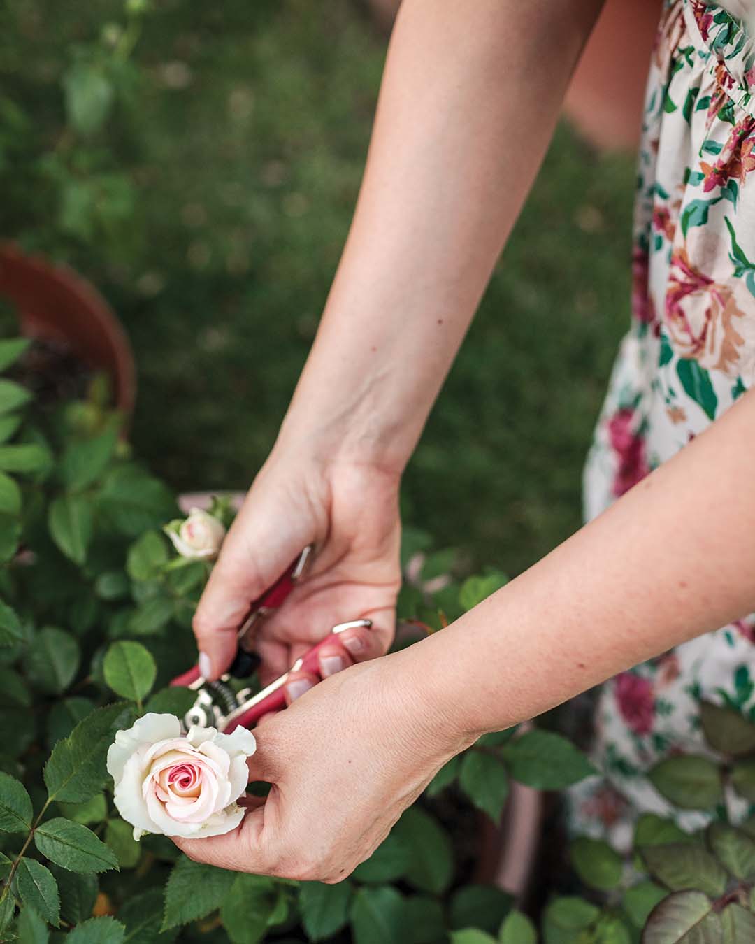 The best time to pick roses is early to midmorning, after the morning dew has evaporated but before the heat of the sun reduces their oils. Choose roses that are just starting to open and cut stems at an angle to promote regrowth. Remove the stem and the leaves and cup the rose in your hand, bunching the petals together. Using sharp scissors, carefully cut the white portion at the bottom of the flower petals, known as the heel of the rose, as it can impart a bitter taste. Shake the petals in a strainer to remove any dust, pollen, or insects and discard any damaged petals. If you wish, you can gently pat the petals with a damp cloth to clean them or even gently rinse them in cool water and lay them on a paper towel to dry completely.