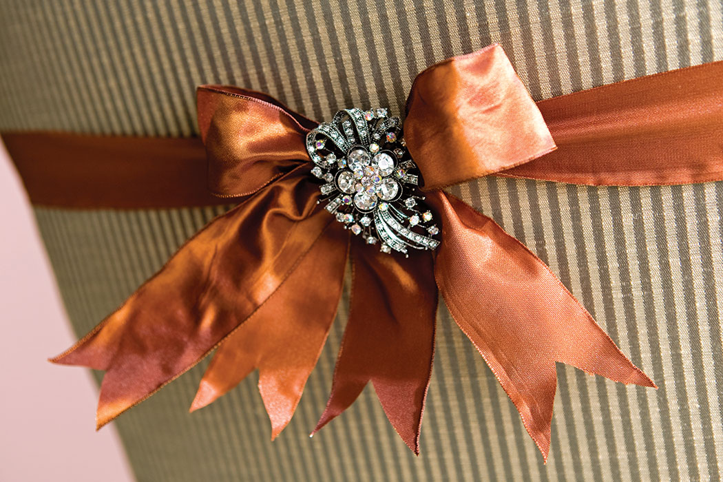A studded brooch (main photo above) adds sparkle and a touch of antique grace. Simply pinned to a bow on lustrous chocolate silk ribbon and tied to the chair, the accent is bold and classic. Use your own collection of heirloom brooches or visit estate sales and antique shops for unique but corresponding pieces.
