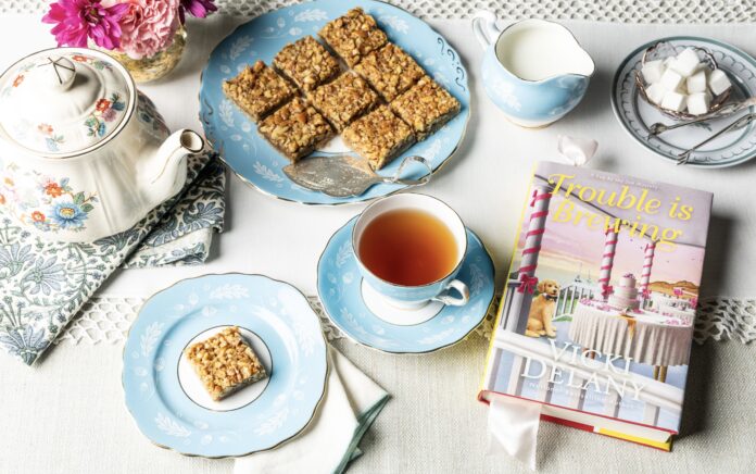 In Trouble Is Brewing by Vicki Delany, Lily Roberts’s tearoom, Tea by the Sea, hosts a bridal shower that takes a sinister turn when a beheaded Raggedy Ann doll, reminiscent of a gift from the bride’s deceased father, causes panic. With tensions rising among the Greenhaugh and Hill families and a bribe attempt adding to the chaos, things go from bad to worse when a guest is found dead under suspicious circumstances. Unravel this gripping mystery while enjoying Maple-Pecan Squares for the perfect pairing.