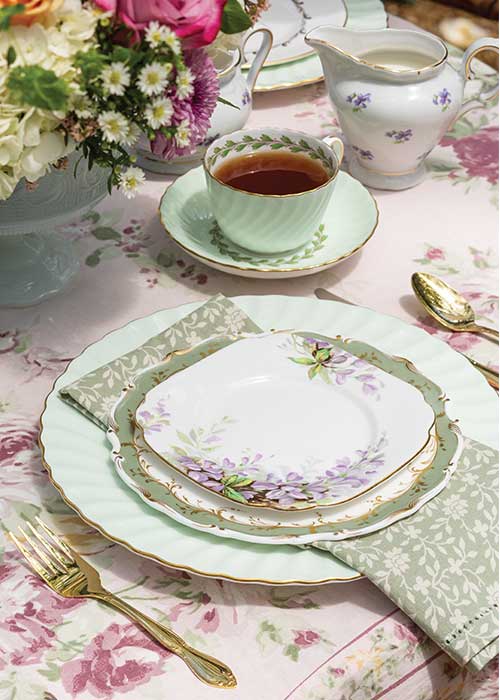 Royal Stafford Sweet Violets teapot; Winterling Remembrance cream pitcher and covered sugar bowl; Adderley Violet oval serving platter; Royal Heidelberg Violet Violet Bouquet handled cake plate and relish dish from Replacements, Ltd. Minton Cheviot Green teacup and saucer set; Minton Shell Green dinner plate; Royal Standard Wistaria bread and butter plate; Royal Standard Lavender Lady dessert platter; Royal Doulton Fountainbleau salad plate; International Silver Enchantress flatware available for rent at Tea and Old Roses.