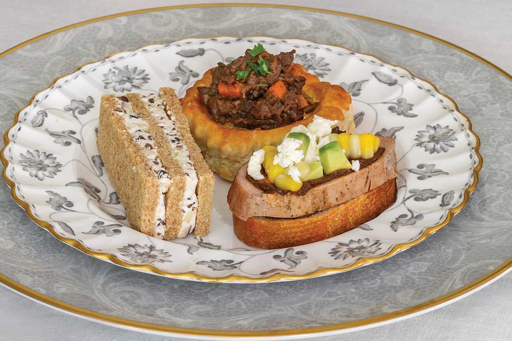 Next, offer guests a selection of chocolate-infused savories, including Beef-Mushroom Carbonnade in Pastry Shells, Pork & Mole Crostini, and Apple, Hazelnut & Cacao Nib Triple-Stack Tea Sandwiches. Pair these delectable bites with a pot of Keemun Hong Mao Feng.