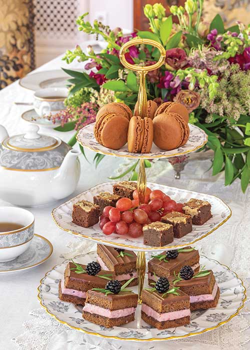 End your afternoon tea on a sweet note with delectable desserts, including Chocolate-Caramel Macarons, Tahini-Swirled Brownies, and Chocolate–Blackberry Mousse Cakes, paired with White Chocolate Mousse Black Tea Blend.