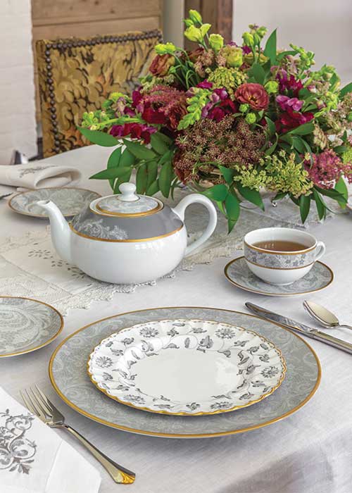 Deshoulières Coquine teapot, teacup, tea saucer, dessert plate, bread and butter plate, dinner plate, sugar bowl, and creamer from BIA Cordon Bleu. Spode Colonel Gray salad plate, 12-inch oval serving platter, 14-inch oval serving platter, and 3-tiered serving tray; Oneida Silver Golden Royal Flute modern hollow knife, teaspoon, salad fork; Oneida Silver Golden Juliard demitasse spoon from Replacements, Ltd. Sferra Classico tablecloth from Sferra. Crown Linen Designs Victorian large napkin from Bromberg’s. Lace table runner and silver vessel for lowers from private collection.