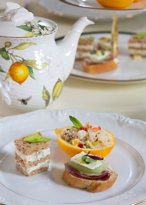 Next, pair The Boulder Tea Company’s Honey Orchid Black Tea with a delectable selection of savories, including our Creamy Celery & Blue Cheese Triple-Stack Sandwiches, Honeydew, Coppa & Feta Canapés, and Lemony Couscous-Shrimp Salad.