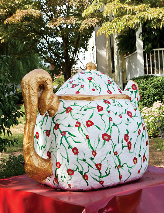 Year after year Bonnie ensures the tearoom is decorated inside and out, from the hats pinned to the wall to the pictures a dear friend painted directly onto it to a painted teapot carved from a dead tree that stands post in front of the house. As the seasons and holidays change, so does the décor. “We are always taking things down and rearranging and decorating,” Bonnie says. “People love to see the changes inside and out.” In late April, visitors will see 25,000 to 35,000 daffodils, tulips, and hyacinths throughout the garden. In December, 10 Christmas trees are stationed throughout the entire tearoom, including one that stands year-round in a shower.