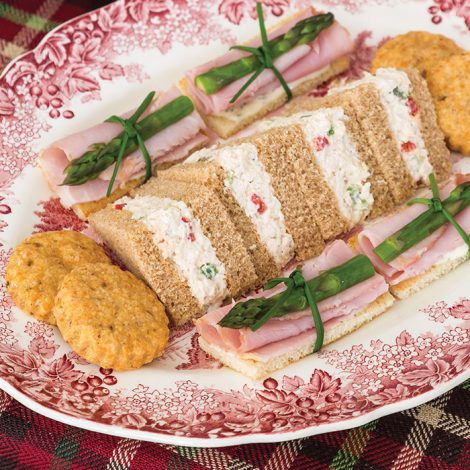 These classic Ham and Cheese Canapés are a great addition to your tea menus. Pictured with Pickle-and-Pimento Chicken Salad Sandwiches and Cheese Wafers.